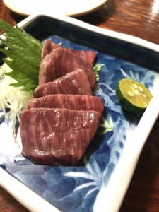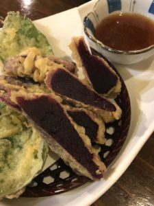紫いもの天ぷら、ラフテーの天ぷら、ピパーチを使った焼きそば、そして贅沢に石垣牛のお刺身を食べました!